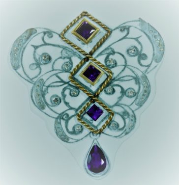 A customer came in wanting a stomacher designed for a dress she is having made. A Stomacher is a very old traditional piece of jewellery or adornment that was sewn onto the front of a garment. The brief was, to include amethyst and use her old jewellery and the diamonds set in them. With earrings to match. She left a piece of the dress material as inspiration for the design. Sam who had initial contact with the customer and knew … Read More